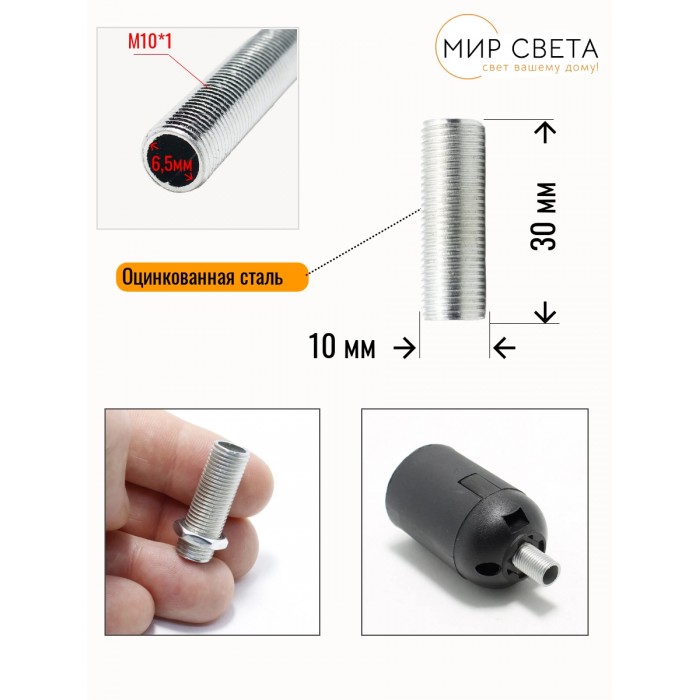 Подробнее о доставке и оплатеТрубка стальная полая со сплошной наружной резьбой по всей длине. Резьба: М10*1, т.е диаметр трубки 10мм, шаг резьбы 1мм. Это мелкая резьба, в люстрах и светильниках чаще всего применяется именно она.